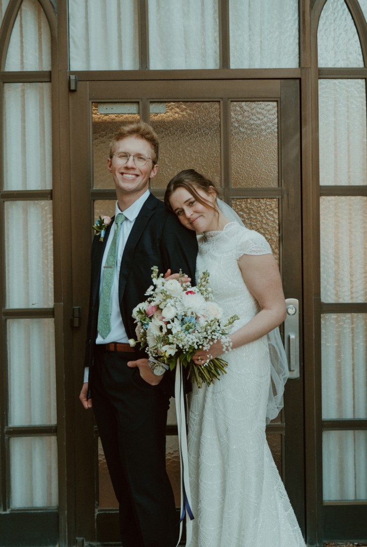 Chloe Waddoups (Skinfill) in her wedding dress with her husband